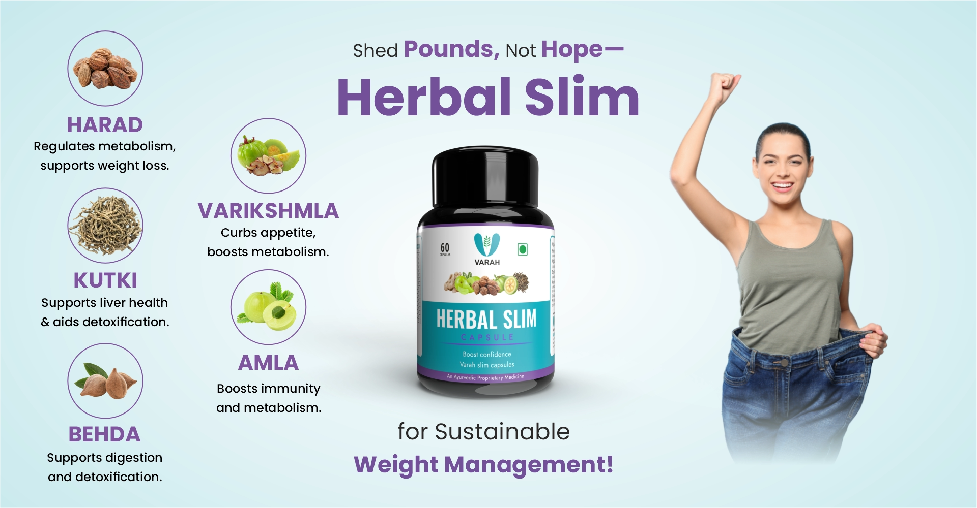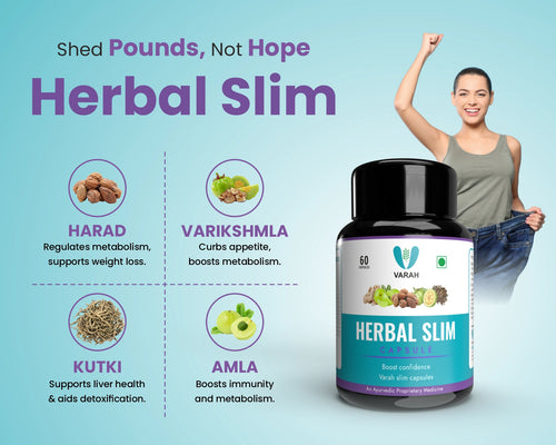 Herbal Slim is a unique blend of 12 powerful Ayurvedic herbs, each chosen for its ability to support weight loss and overall health. This carefully crafted formula works naturally with your body to boost metabolism, cleanse your gut, and promote healthy weight loss without any harmful side effects. Unlike synthetic weight loss supplements, this best natural supplement focuses on your overall well-being, ensuring long-lasting results and a healthier you.